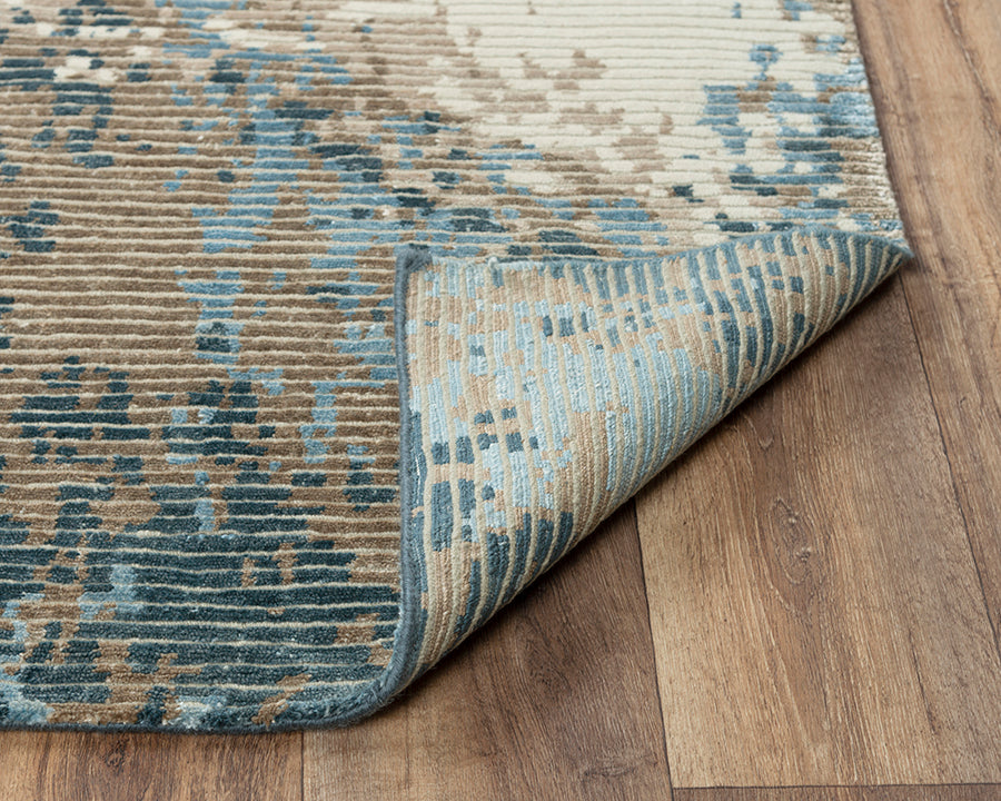 The Finesse Beige and Blue Hand-knotted Abstract Rug alternates between beige rows and sweeps of light blue, dark blue, taupe, and ivory colors to create an attractive abstract design with modern, industrial flair. Each rug is hand-knotted and also washed, carved, and surged by hand. The yarn is 80-percent New Zealand wool and 20-percent luminous viscose for lasting beauty.