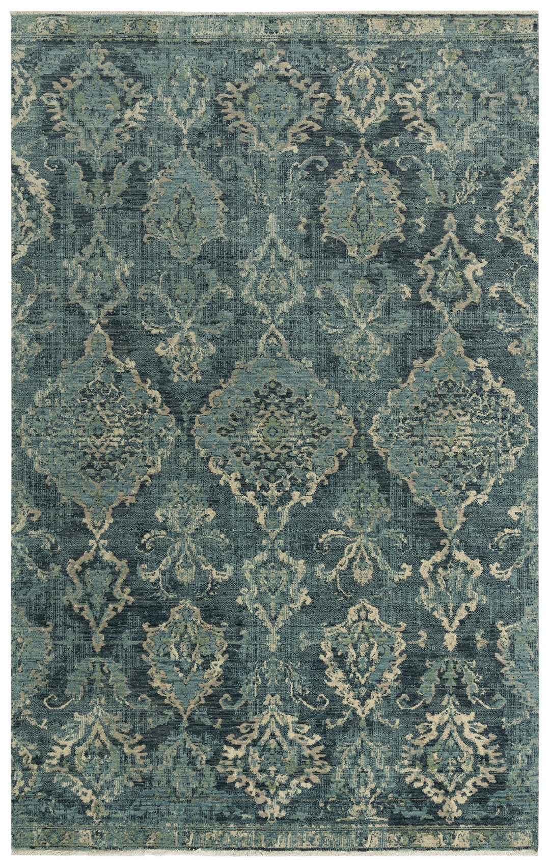 Beautifully complete your transitional, industrial look using the Platinum Blue, Beige, and Ivory Distressed Classical Rug. It is side woven using soft 100-percent wool blend, then stone washed, sheared, and surged by hand. Featuring a distressed, classical floral pattern, the .25-inch fringe finishes the short-piled rug to perfection.